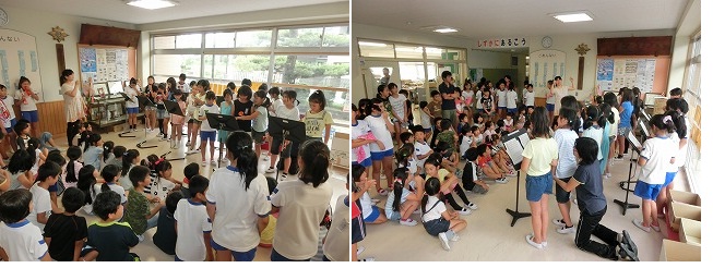 6月8日に音楽クラブによるゲリラコンサートがありました。これは、ミニコンサートを予告なしに突然校内で行うものです。コンサートは、お昼休みに1階昇降口ホールの一角で行われました。あまりたくさんの子が集まってきても座る場所がないので、事前に宣伝はしていませんでした。でも当日は、昇降口を通りかかった子ども達や先生が徐々周りを取り囲み、自然な雰囲気でコンサートが始まりました。ハンドベルの演奏で、曲目は「アナと雪の女王」の「レット・イット・ゴー」。みんなよく知っている曲です。アンコールもあって2回演奏してもらい、最後には大きな拍手が上がりました。日常から音楽に親しみ触れ合える、素敵な試みだと思いました。 |