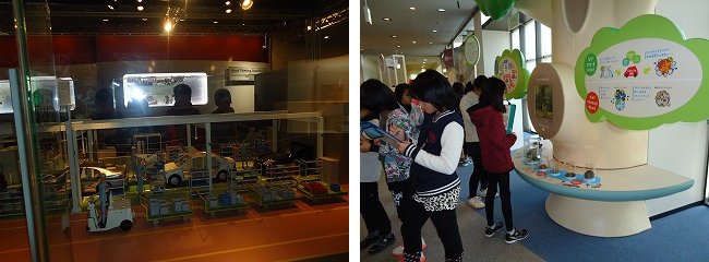 そのあとで、トヨタ会館へ行き、 先ほど見せていただいた工場での様子を模型にしたものや、 さらに、使わなくなった材料の再利用の展示などもあり 子どもたちは熱心にメモをとりました。 水素カーなどの、エコカーも見せていただきました。 |