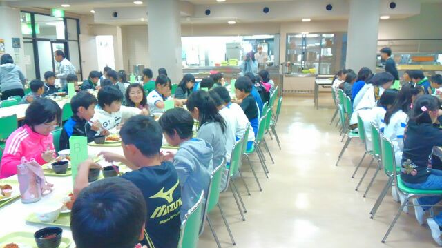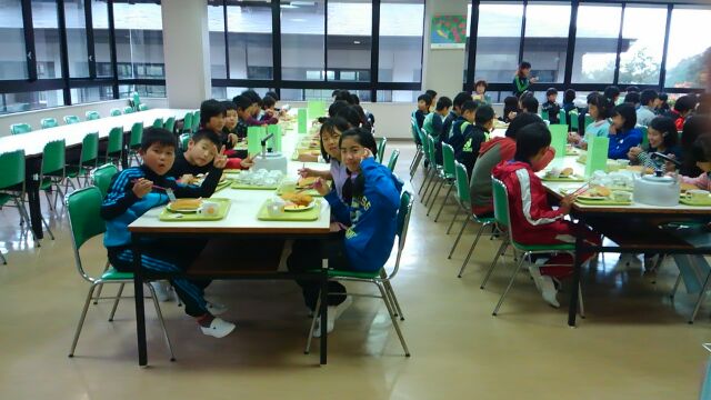 食堂での夕食です。お腹がすいた子どもたちが元気におかわりしています。