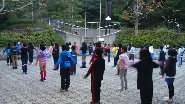 朝のつどいです。ラジオ体操をして、からだを目覚めさせました。