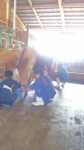 ふれあい牧場で搾乳体験をしています。ドキドキワクワク笑顔一杯です。