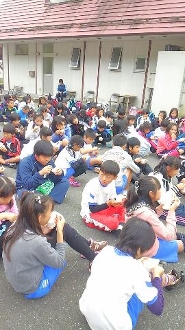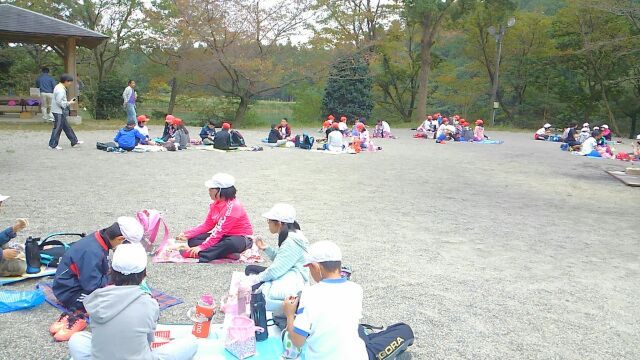 大門池広場で、昼食です。アイスクリーム食べた後でも、おうちの人のお弁当は格別に美味く、完食する子どもたちです。