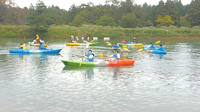 大門池でのカヤックが始まりました。パドルの息を合わせて協力しながら漕いでいます。