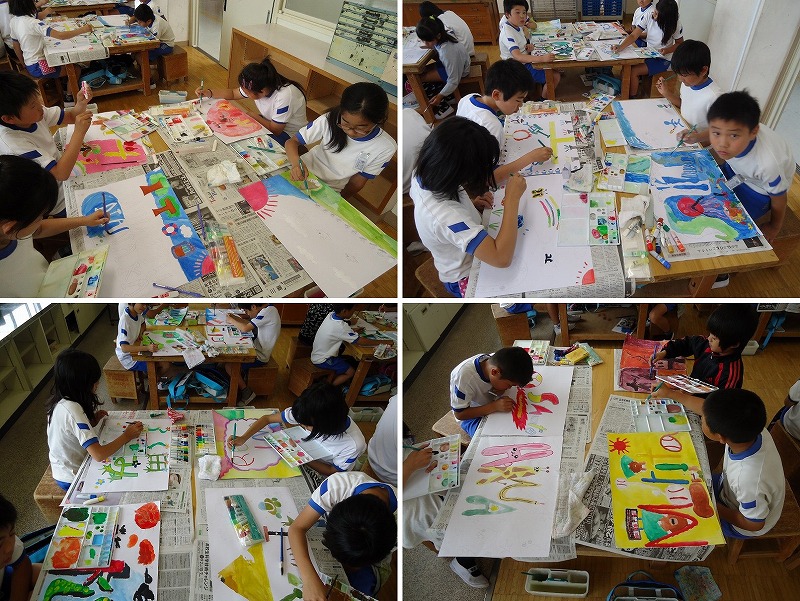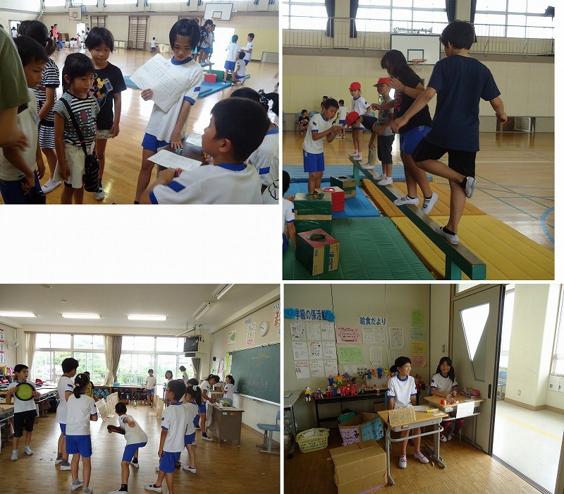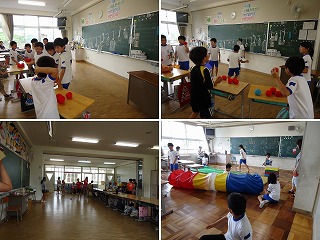 5Bのスポーツチャレンジ大会では 『ペットボトル当て』『しょうがい物レース』を考えました。 『ペットボトル当て』ではlペットボトルをロープでぶら下げ 玉入れの玉をぶつけます。 ぶらぶらするペットボトルに玉をぶつけるのはなかなか難しい・・・ やってくるグループに楽しんでもらえるよう 玉を拾う人や、説明する人など、それぞれ役割を決めて頑張っていました。 また、『しょうがい物レース』では、トンネルや跳び箱、ネットなどを使って タイムレースを行いました。 前日から、チャレンジ大会を楽しみに どんな順番にすればよいかなど、考えを出し合って 見事なレース場を作り上げました。 |