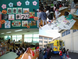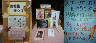 10月30日は、朝から図書委員の子どもたちによる大型絵本の読み聞かせ、20分休みには図書ボランティアのみなさんによるイベント工作、午後は自動車文庫と読書に関するイベント満載でした。お話を聞いて楽しい、本に触れて楽しい、図書館まつりは、まだまだ続きます。 |