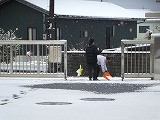 今朝は、未明から降った雪のため、子どもたちが登校する通学路や橋の上に雪が積もっていました。積雪はそれほど深くありませんでしたが、通学路に一部には凍結している個所もありました。