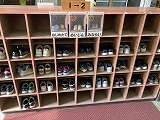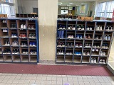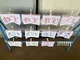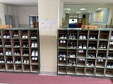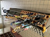 朝の下駄箱や傘立てと、雑巾の様子です。靴箱はどのクラスもきれいにそろえて入っています。傘立ても、きちんと巻いて立ててあります。雑巾には、どの位置で掛けておくとよいのか目印も示されています。