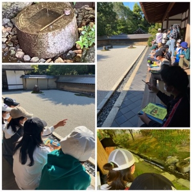 枯山水の庭には、15の石が石庭にあるのですが、どこから見ても14しか見られないのです。子どもたちは、必死に数えていました。ガイドさんから、心の目で見てみると見えるとの説明を聞きました。