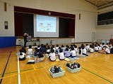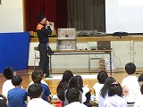 まず体育館で、火災に対して普段から気を付けるべきことのお話をしていただきました。その後、油に水をそそぐとどのようなことが起こるのかを実験で見せていただきました。子どもたちは、その爆発力にとても驚いた様子でした。