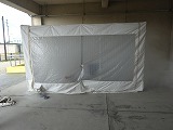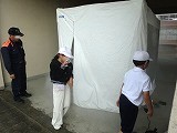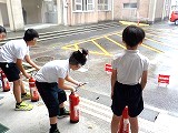 次に、オープンホールや昇降口前で、煙が充満した建物の中を通る疑似体験をしたり消火器の使い方の手順を教わったりしました。本日の煙体験は、熱さも煙の黒さもありませんでしたが、子どもたちは実際の火事の恐ろしさが理解できたようでした。