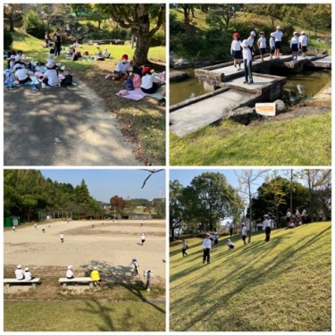 2.4年生は、桜ハイツ公園に来ています。広いグランドでは鬼遊び、斜面滑りなどで、遊んでいます。お腹が空いたので、早くご飯を食べたい、ちょっと疲れたなどと話している子もいました。