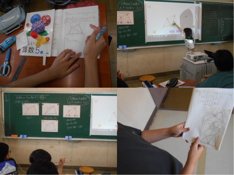 多くの子どもたちは,既習事項である三角形の内角の和は180°であるということを使い,1本の対角線を描いて考えていました。