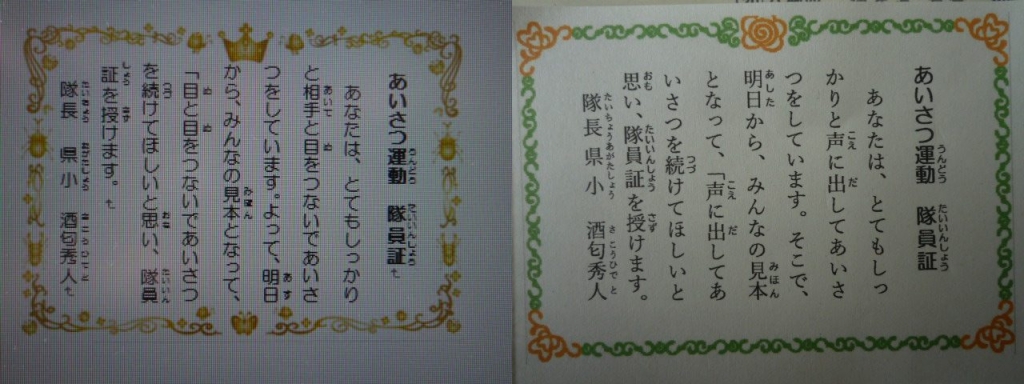子どもたちには、登校時に、しっかり声に出している子にこのようなカードを渡し、進んで取り組んでもらえるようにと願っています。