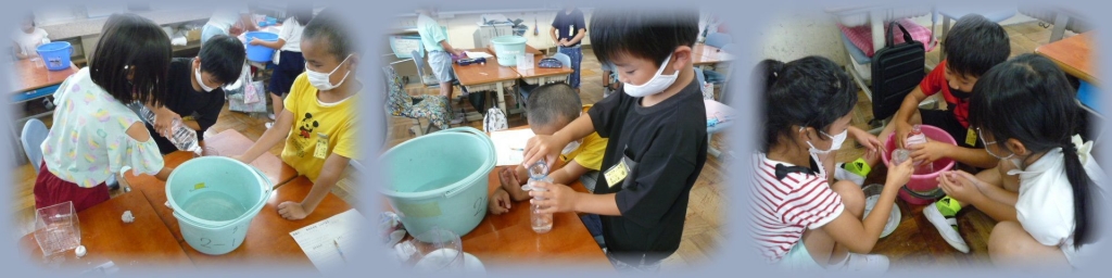 大きなペットボトルに水を入れて、1Lマスに移し替えて測る子たちと、1Lマスからペットボトルに移し替えて測る子たちの姿が見られました。