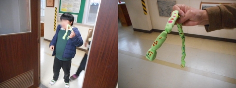 この子は,とても絵が得意で,今回の題材は,紙粘土を使った工作でしたが,へびを作り,その模様,顔などがすてきに出来上がっていました。