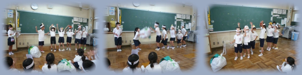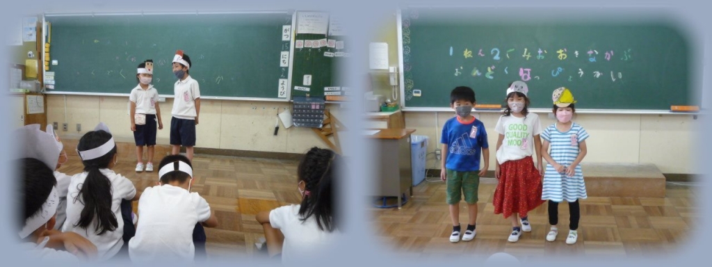 どちらのクラスとも、それぞれのグループでは、ナレーション、おじいさん、おばあさん、まご、犬、ねこ、ねずみといった登場人物の役割分担、せりふの分担、動きについて工夫しているところがちがいます。