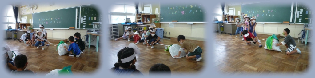 例えば、おじいさん役の子が、「おじいさんはかぶをひっぱって」というところをナレーションの子が言うグループとおじいさん役の子が言うグループ。また、あるグループは「〇〇が引っ張って」と言ったあと、かぶを引っ張る動きに合わせてかぶを転がすような動きを入れるグループ、かぶをひっぱるときときに、「うんとこしょ」「どっこいしょ」で伸ばしている足を変えるグループなど。たくさんの工夫がみられました。