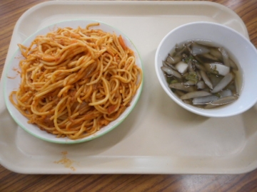 メニューはスパゲティとごぼう,里芋のスープでした。