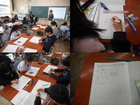二等辺三角形の描き方を説明してもらって,先生方,「なぜコンパスを使うと二等辺三角形が描けるか」というように,質問され,子どもたちはグループで話をしていました。