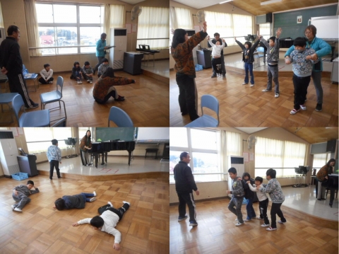 ピアノで,軽快なリズムの曲,ゆっくり暗い曲など,その曲に合わせて,子どもたちは思い思いの動きをしていました。例えば,寝転ぶ,電車のようにつながる・・・。