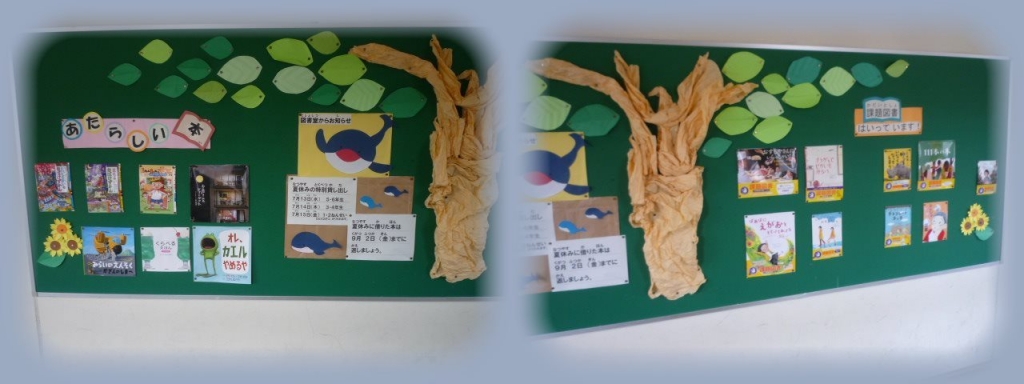 図書館司書の方がこのようにセッティングしてくれました。夏休みに開館する日がありますので、かりた本を読み終わって、またかりたい人は来てね。