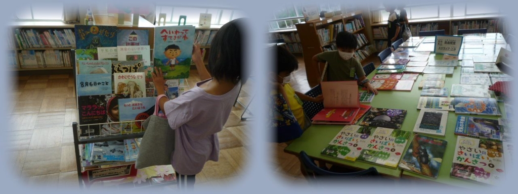 図書室内には、自由研究のコーナー、新しい本のコーナー、戦争がテーマーの本など、この時期にあった本が、机の上に集めて並べられています。
