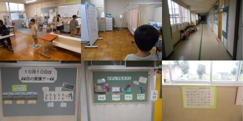 視力をはかるだけでなく,10月10日が目の愛護デーということで,廊下の掲示板には,視力が悪くなった時の見え方,「ビジョントレーニング」(目の動きのトレーニング)の掲示などがあり,待っている間も自分の目を大切にする資料があります。