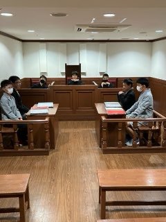 裁判所にて、裁判官、検事、弁護士などに分かれて、模擬裁判を体験しました。
