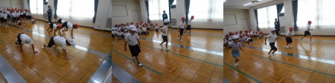 四つん這いで歩く,4人そろって歩く,走るなど,様々な条件で運動に取り組みました。