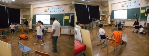 今日,印象深かったのは,トンボ,チョウといった跳ぶ生き物の真似をしている様子です。担当は子どもの手の動かし方の違いを捉えて,演奏する曲を替え,子どもたちの様々な動きを引き出します。