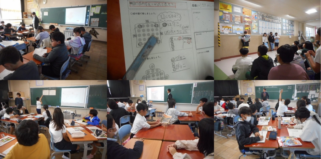 5年生では、分数のたしざんでした。5・6年生は、算数の授業を少人数で行うために3クラスで行っています。少人数で指導することで、一人ひとりをよりきめ細やかに見ることができます。今日はその様子を見ていただくことができました。また、後半は、ジャンプの問をグループで考えている場面も見ていただくことができました。