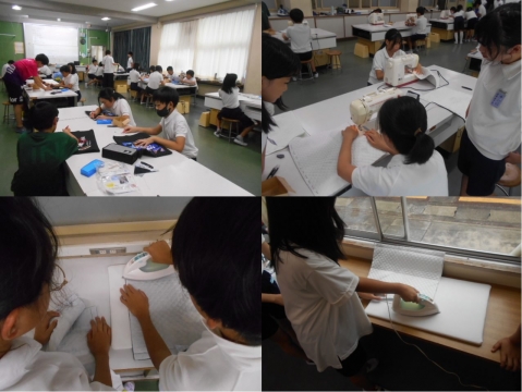 生地を裏返して,横と下のふちを縫おうとしているところでした。チャコペンで印をつけ,アイロンをかけていました。