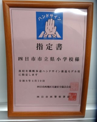 本日、警察の方と交通安全協会の方がお越しになり、「ハンドサイン」を積極的に行う「モデル校の指定書」を頂きました。