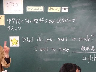 今日の英語の時間も、それぞれの人が中学生なったら頑張りたい教科をプリントに書いてから英語で尋ねたり答えたりしていました。中には、笑顔でジェスチャーを付けながら答えている人もいました。