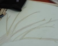 鉛筆で枝の下書きを描き、色鉛筆などを使って枝に色を付けています。枝の形もその人なりの工夫があり、様々な形の木になっています。また枝に色を付ける際にも、様々な色を幾重にも重ねていました。どの人の工夫も、とても独創的で素敵てした。