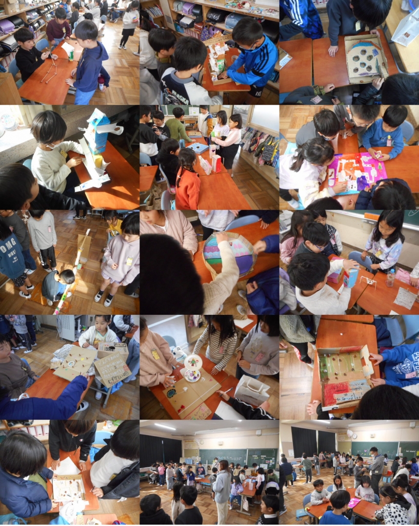 今日は,2年生の子たちが生活科で作った,どんぐりを使ったおもちゃを1年生にもあそんでもらおうと2年生の教室に招待しました。