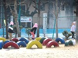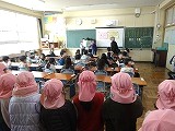 1年生が授業を見せたり学校の様子を紹介したりしました。その後保育園の人たちは、各学年の様子を見学してから、運動場の遊具を使って遊びました。