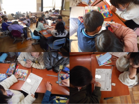 係を決めた後,同じ係になった子とグループになり,仕事内容,当番のしごとについて,名前などをポスターに描いていました。