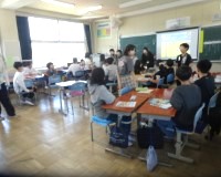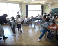授業はグループ対抗で、ゲーム形式で英会話を行いました。ポイント表示が人気ゲームのレースのようになっていたため、6年生の人たちは大きな声で英会話をしたり集中して先生の言葉を聴いたりしていました。