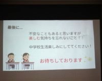 まず、生徒の人たちが中学校へ入学後の生活についてお話してくれました。その後、クラブや勉強のこと等スライドを使って説明してくれました。次に、6年生たちから様々な質問が出され、それを生徒の人たちが丁寧に答えてくれました。最後に中学校の先生から少しだけお話をしていただきました。