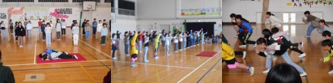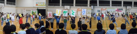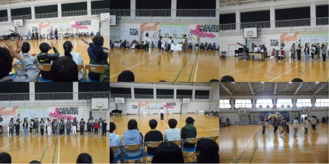 「思い出のメモリー」という題でした。壁に掲示してもらった,校歌や蛍の掲示はとても素敵にできあがっていました。また,「ソーラン節の力強いダンス」,外国語で歌った「喜びの歌,」と「ゆかいに歩けば」の