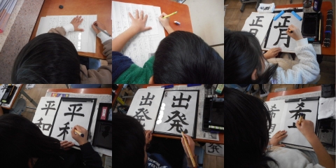 1・2年生の硬筆は,「ともだち」「お手紙」,3年生以上の習字の題字は「正月」「平和」「出発」「希望」と,新しい年にふさわしいもので,今年の目標も考えながら書いていました。どの学年も,静まり返った教室の中で,集中して書いていました。
