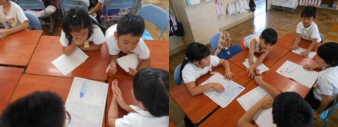 低学年ではペア(2人)での対話をしているのですが,今日の国語の学習では,グループでの対話に挑戦しました。担任からは,相槌をしながら聞くこと,後で質問をすることなどの条件を伝え,「夏休みのできごと」を伝え合うようにと指示がありました。