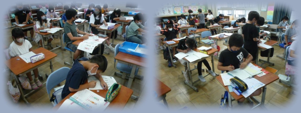 5年生も、夏休みの宿題の説明やプリント配布をしていました。