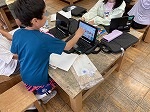 金づちの両面の使い方を意識したり安全に気を付けたりしながら学習しています。今日は、板に絵を描く図案を考えたりタブレットで参考にするものを選んだりしながら、先生の前で少人数ずつくぎ打ちの練習に取り組みました。