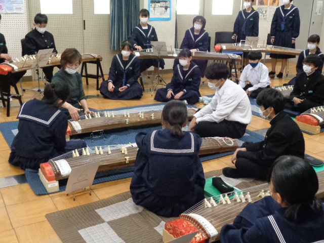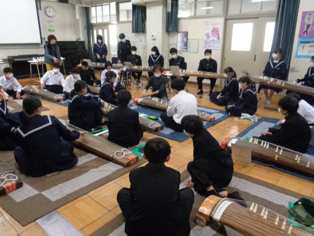 1,2年生音楽科で朝明中恒例のお琴の授業が始まりました。