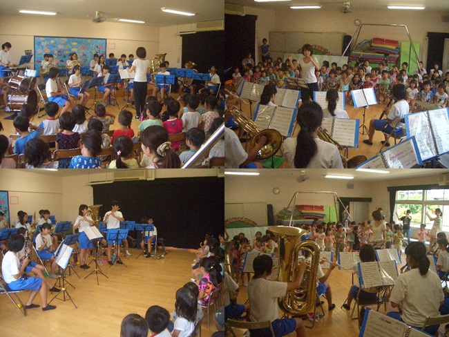 本日、「中学校区学びの一体化」の保育園・幼稚園との交流の一環として、吹奏楽部の2年生が大矢知保育園で演奏を行いました。「さんぽ(となりのトトロより)」、「コナンのテーマ」、「アンパンマン」、「妖怪ウォッチ」といった園児になじみにある曲の演奏と各楽器の紹介に、園児たちも大変興味を持って聴いていました。アンコールの二度目の「妖怪ウォッチ」の演奏では、園児たちも全員が踊ってくれました。