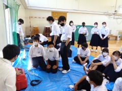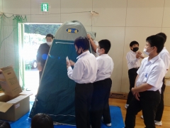 実際に防災倉庫に入っているものを見せていただいて、使い方のレクチャーもしていただきました。これからこの地域の未来を担っていく中学生です。朝明中学校は避難所にも指定されています。今後起こると言われている災害に備えて学校で使えるものを理解し、もしもの際に、地域の一員として活躍してほしいです。