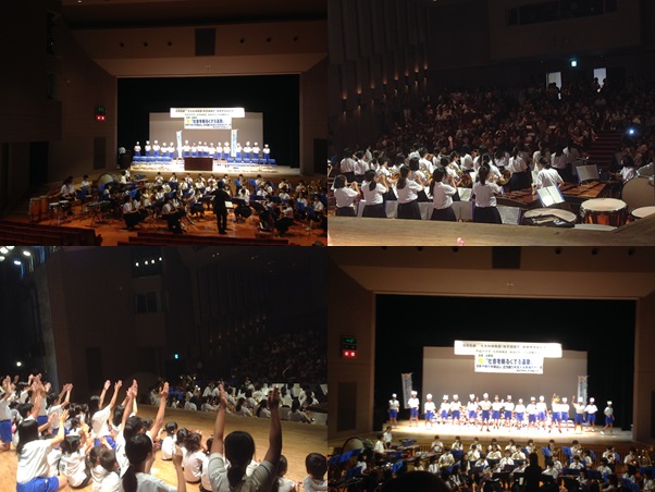 7月10日(日)大矢知地区社会福祉協議会主催の『社会を明るくする運動』が「あさけプラザ」にて開催され、地域貢献活動の一環として本校ブラスバンド部の生徒65名が会場で演奏を行いました。「アンパンマン」、「妖怪ウオッチ」といった小さいお子さん向けの曲を披露し、演奏の中で、部員が舞台上で幼稚園児と手を取り合って踊るなどして、会場を大いに盛り上げました。来場された地域の多くの方々からも、「大変感動した。」とのお言葉をいただきました。 |