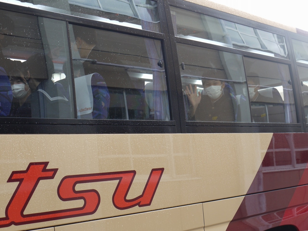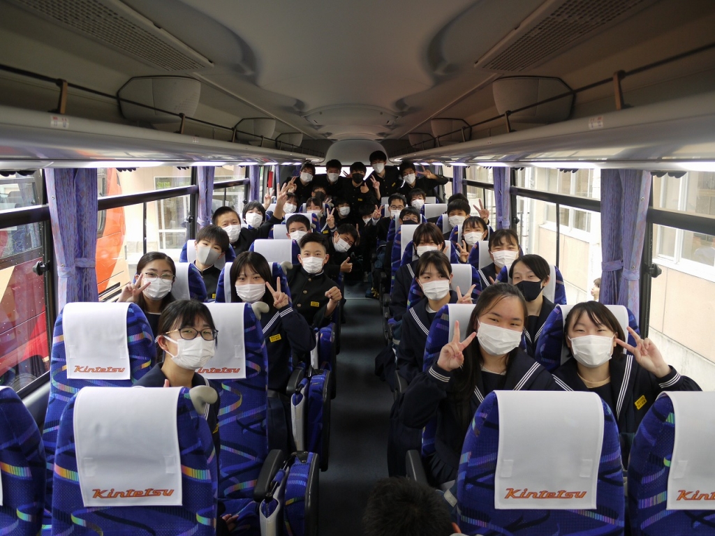 本日、行われる三泗音楽会に向けて、朝明中学校代表として3年1組がバスで出発しました。また、吹奏楽部のメンバーも楽器を持参して出発しました。